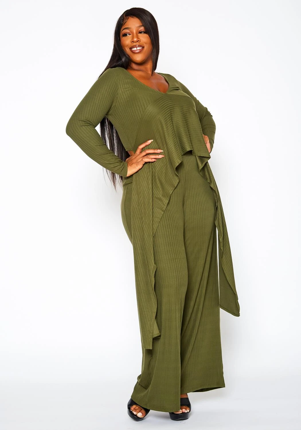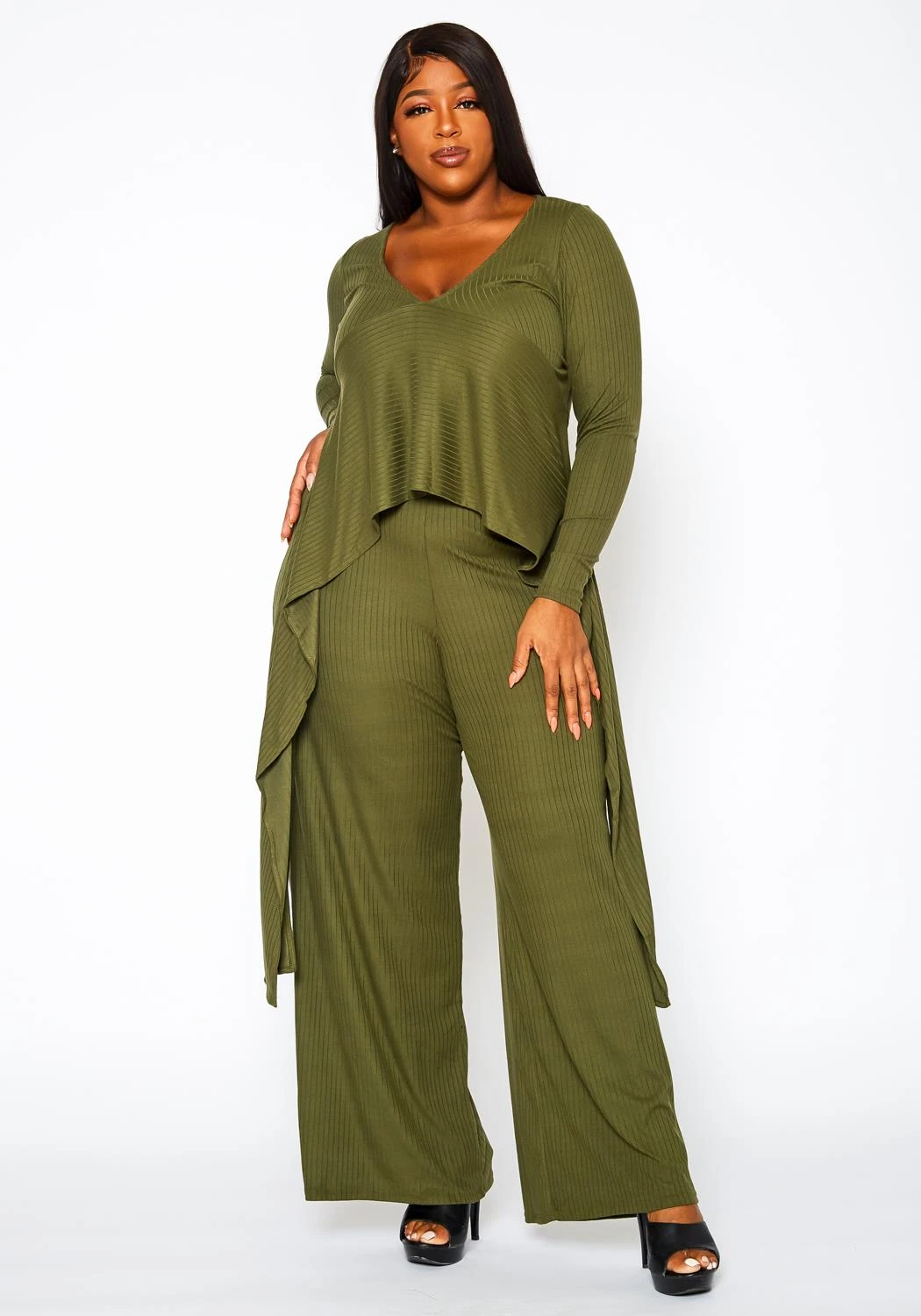 Plus size women’s matching set in ribbed knit material. Features a v-neck, long sleeve, split hem longline top and straight leg flare pants.