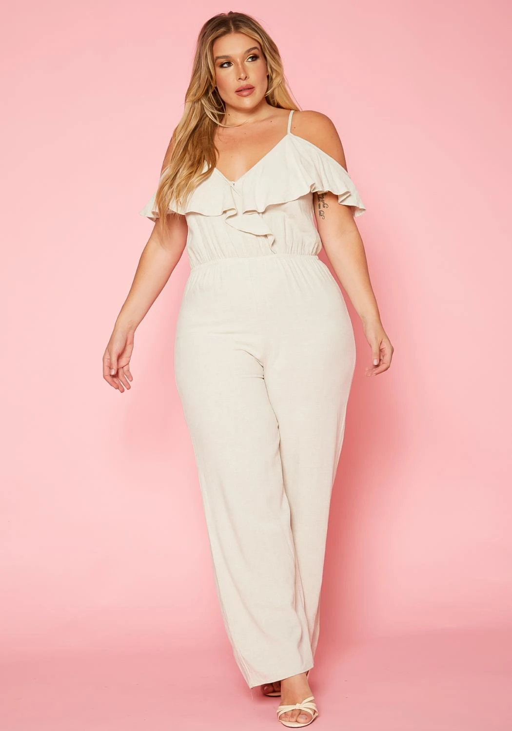 Effortless plus size women’s jumpsuit in off shoulder style, cami shoulder straps, ruffle hem details, v-neck front and flare leg hem.