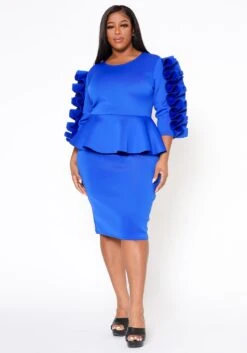 Gorgeous plus size women’s two piece set in silver sequin material. Features a cowl neck, long sleeve blouse and high waist, slit detailed mini skirt.