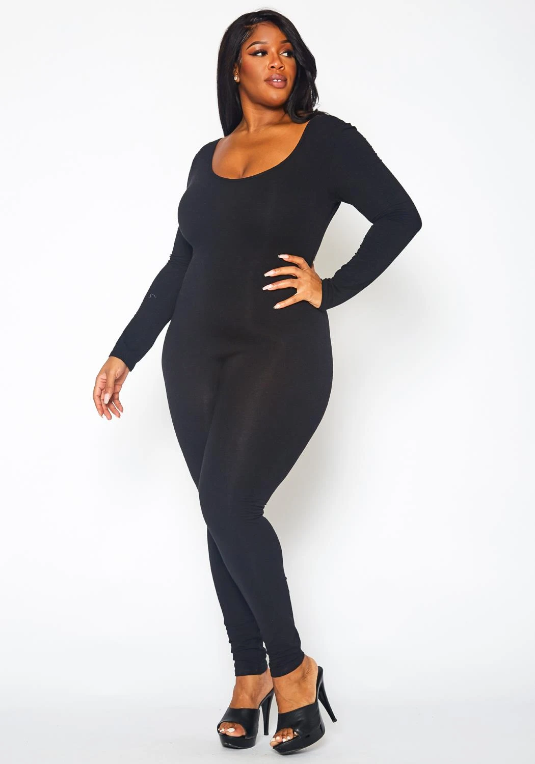 Must have solid color bodycon jumpsuit for plus size women in scoop neck style, low back design and fitted long sleeves.