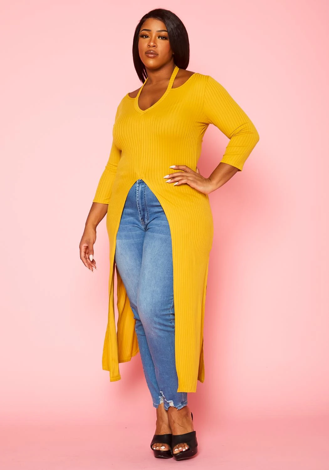 Plus size women’s longline top with halter neck tie, 3/4 fitted long sleeves and split hem design.