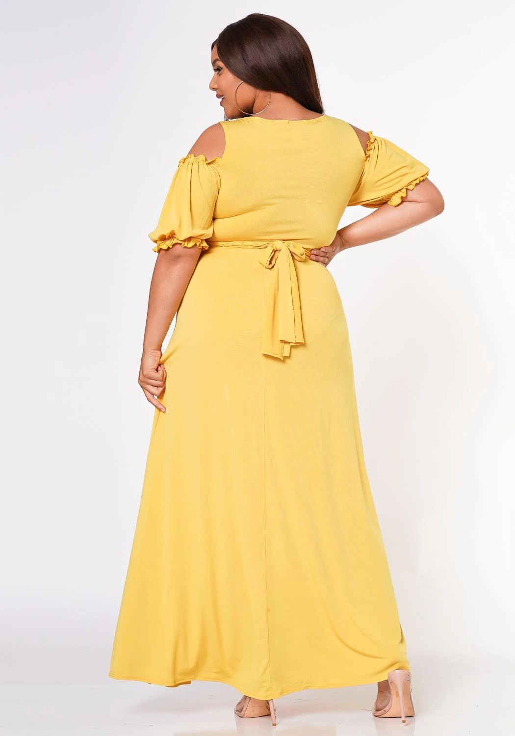 Gorgeous plus size women’s matching set which features a cold shoulder, short sleeve, v-neck, tie front crop top and a high waist double slit hem maxi flare skirt.
