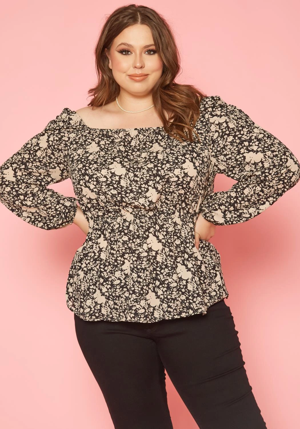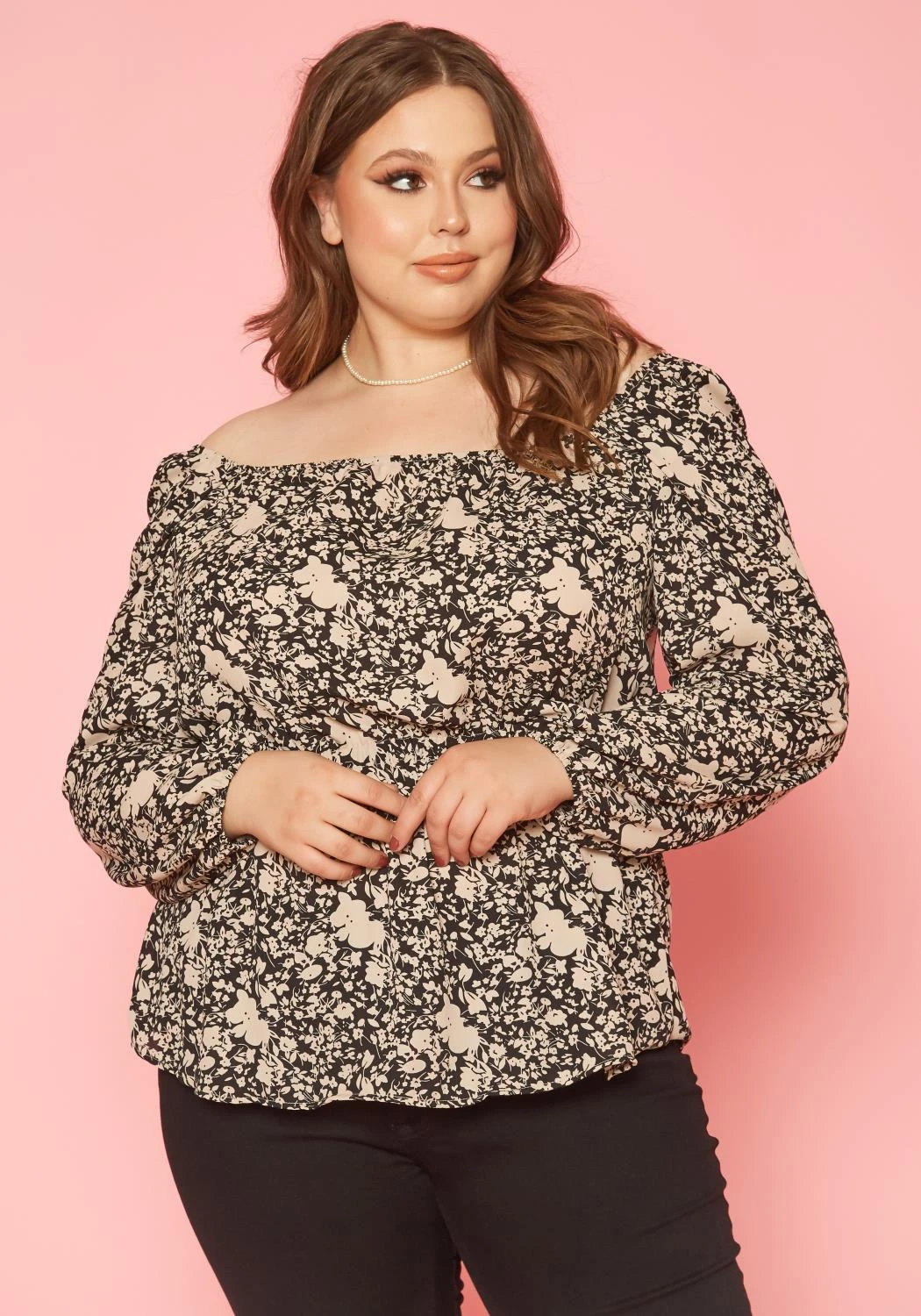 Lovely plus size women’s top in vintage floral print, off shoulder style, long sleeves, fitted wrist cuffs and cinched waistline.