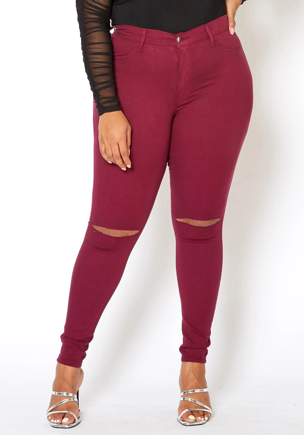 Asoph x Vibrant plus size women’s skinny denim jeans available in 4 everyday colors plus featuring a classic knee rip hem, belt loop holes and pockets.