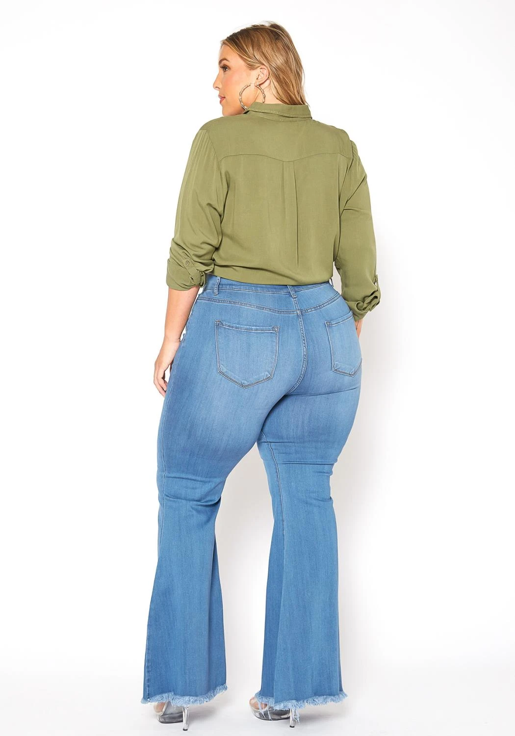 Asoph x Vibrant plus size women’s bold flared bell bottom high waist jean which features a raw cut end hem, belt loop holes and pockets.