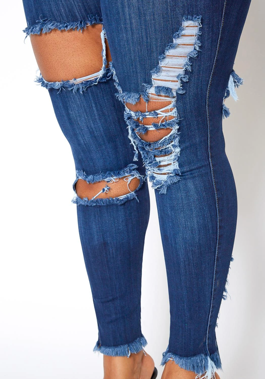 Asoph x Vibrant plus size women’s medium-dark washed denim skinny jeans with front and back distressed hems, belt loop holes and pockets.
