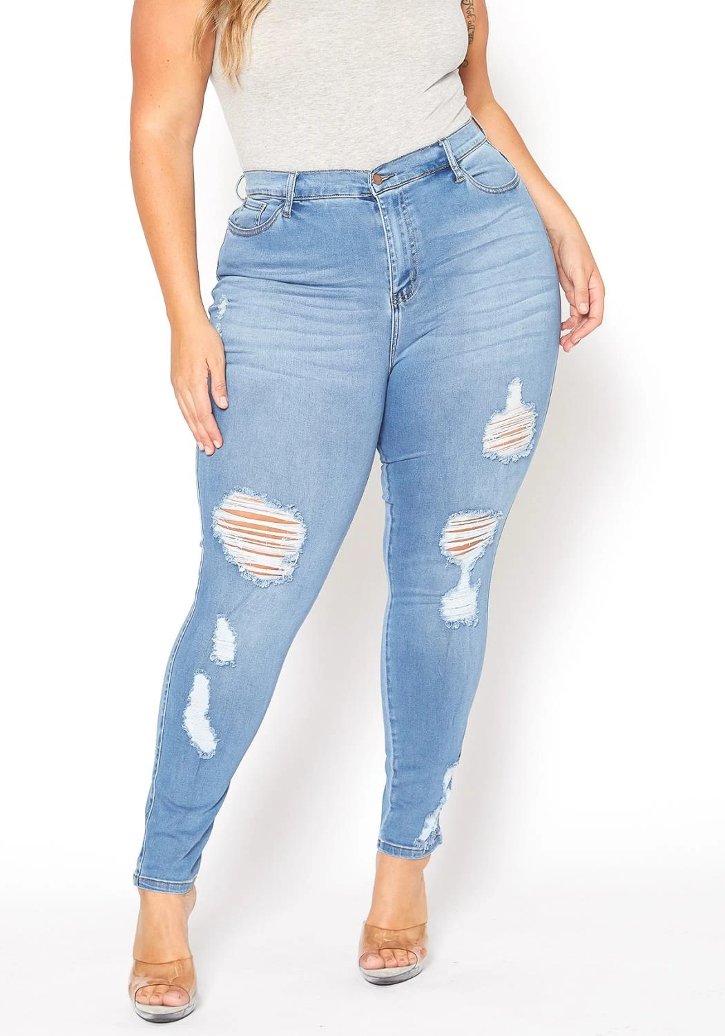 Asoph x Vibrant plus size women’s mid waist skinny jeans in light blue color features distress hems, belt loop holes and pockets.